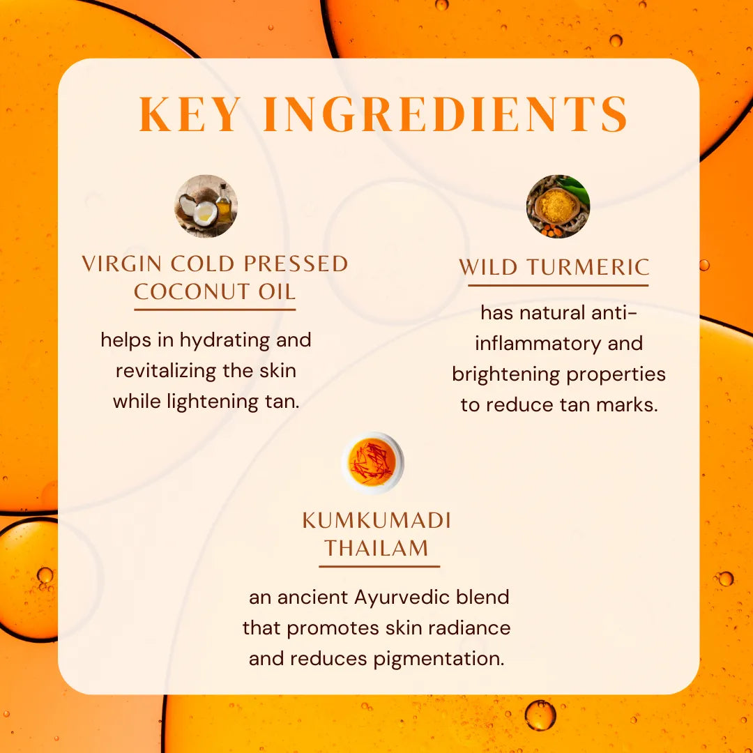 Bask in Nature’s De-tan Oil is a concoction extracted out of Vetiver, Wild Turmeric, Goose berry and Indian Madder combined with Kumkumadi  Tailam and Virgin Cold Pressed Coconut Oil. It used in Bridal Skincare from time immemorial. This gentle Oil lightens Sun Tan and rejuvenates the delicate tissues of the skin to offer an even tone with luminous effect.